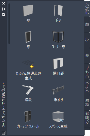 | デザイン パレット グループにあるデザイン パレット | [標準]カーテン ウォール スタイルと、その他のカーテン ウォール プロパティの既定の設定を備えたツール |