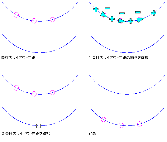 レイアウト曲線を 1 つのオブジェクトから別のオブジェクトに移動するには、次の手順を実行します。 この操作中、レイアウト モードは保持されます。 節点が等間隔に配置された状態でレイアウト曲線が挿入された場合、節点は新しいオブジェクト上でも等間隔に配置されます。
