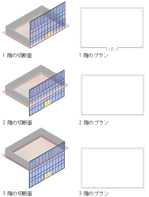 次のイメージは、3 階にわたるカーテン ウォールを示しています。左側のイメージは、対応するレベル図面の切断面を示しています。右側に表示されているプランは、カーテン ウォールが各レベルのプラン ビューでどのように表示されるかを示しています。別の平面図ではドアおよびマリオンが異なって見えていることに注意してください。