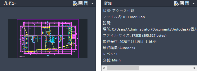 [プレビュー/詳細ペイン]を選択すると、 (プレビュー)をクリックしてプレビューを表示したり、 (詳細)をクリックして選択した図面ファイルの説明を表示したりできます。
