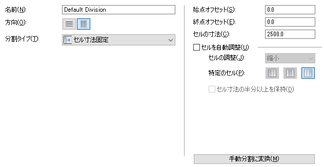 垂直グリッドを定義している場合、セルの寸法はマリオンからマリオンまでのセルの長さになります。水平グリッドを定義している場合、セルの寸法はセルの高さになります。
