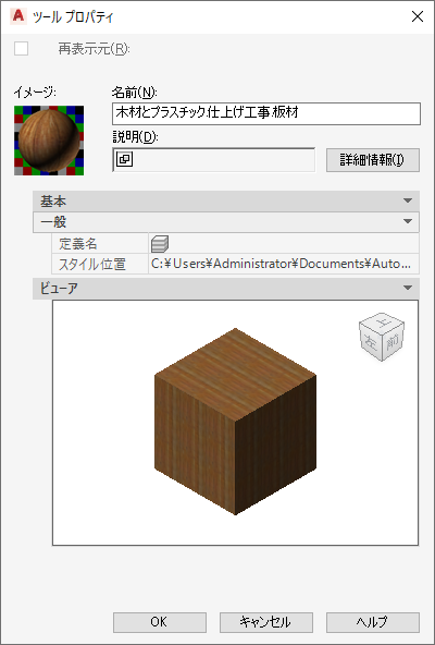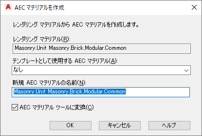 - レンダリング マテリアルを AutoCAD Architecture 2027 toolset パレットにドラッグした場合は、AEC マテリアル ツールの作成を終了します。