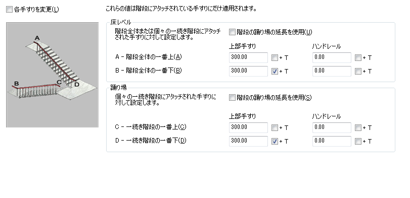 [踊り場]で、[上部手すり]と[ハンドレール]に値を入力します。踏み板の長さを延長値に加算する場合は、値の横にある[+ T]をオンにします。 |