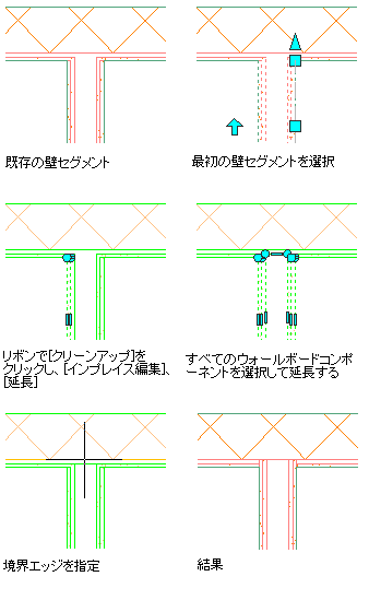 コンポーネントを延長することで、壁交差を修正するには、次の手順を使用します。延長境界は、線分、円弧、円、ポリライン、または壁コンポーネントのエッジです。