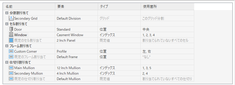 カーテン ウォール スタイルの要素定義を作成した後は、それらの定義を、分割、セルの面材、フレーム、マリオンなど、カーテン ウォールのそれぞれの要素タイプに割り当てることができます。