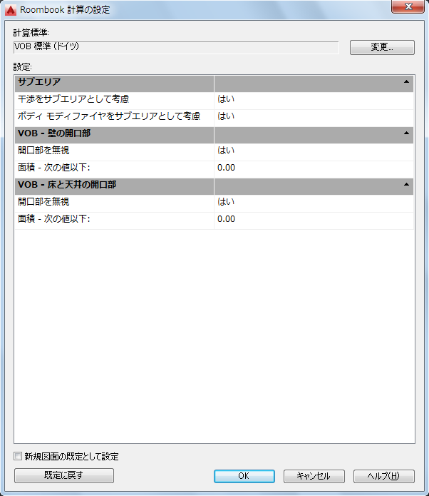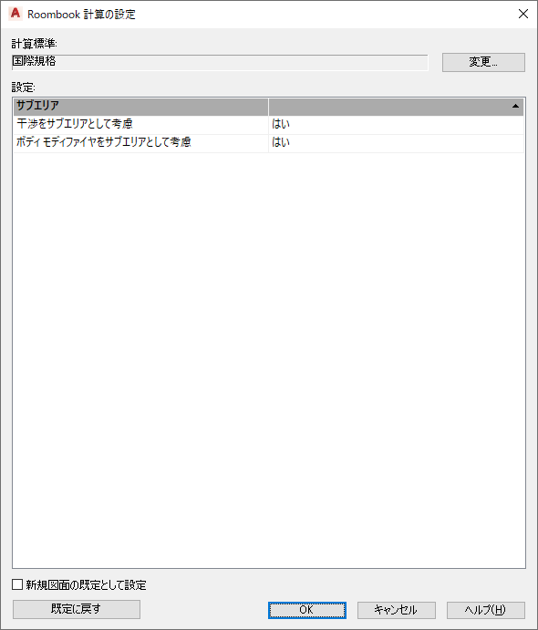 これで、定義されている計算標準が現在の設定となり、次回のルーム量計算に使用されます。