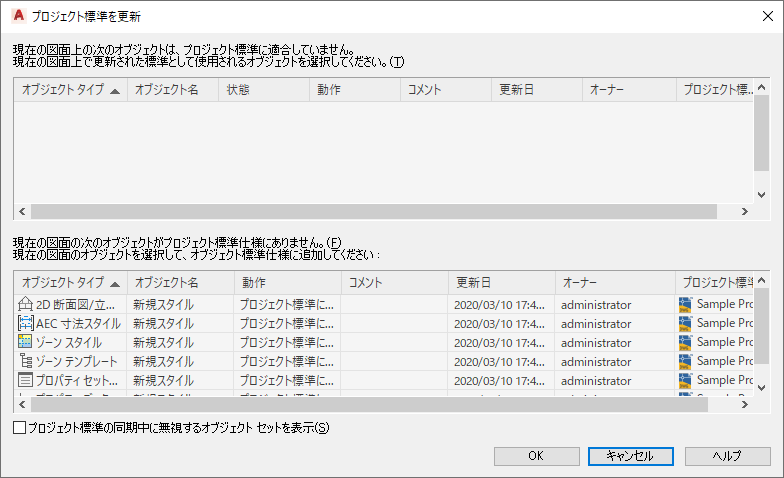 この場合は、[プロジェクト標準仕様の同期中に無視するオブジェクト セットを表示]を選択するか、スタイル マネージャまたは表示マネージャのスタイルや表示設定から[無視する]フラグを削除した場合を除き、スタイルまたは表示設定は以後の同期では表示されません。