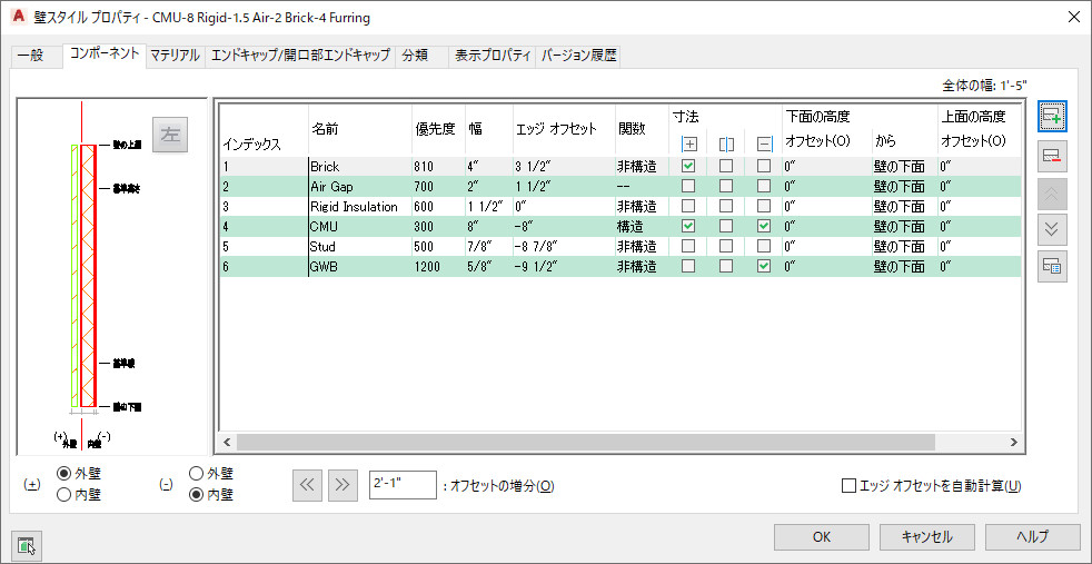 壁スタイルの各コンポーネントは、空洞壁のエアー ギャップなど、壁または壁のマテリアルの構造コンポーネントに対応しています。 壁コンポーネントを作成するときは、次に示すコンポーネントの特性を指定します。