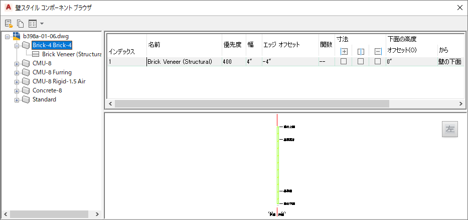 | ブラウザの左ペインのツリー構造 | 壁スタイルを展開して、スタイル内のコンポーネントのリストを表示できます。 左ペインで壁スタイルを選択すると、右ペインでそのコンポーネントのプロパティを表示したり、壁スタイルを確認したりできます。 コンテキスト メニューを使用して、個々のコンポーネントや選択したスタイルのすべてのコンポーネントをコピーすることができます。次に、そのコンポーネントを編集中のスタイルに貼り付けることができます。 |