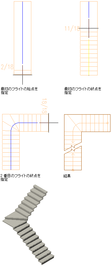 - 90 度のターンが 1 つある階段を描き、[Enter]を押します。