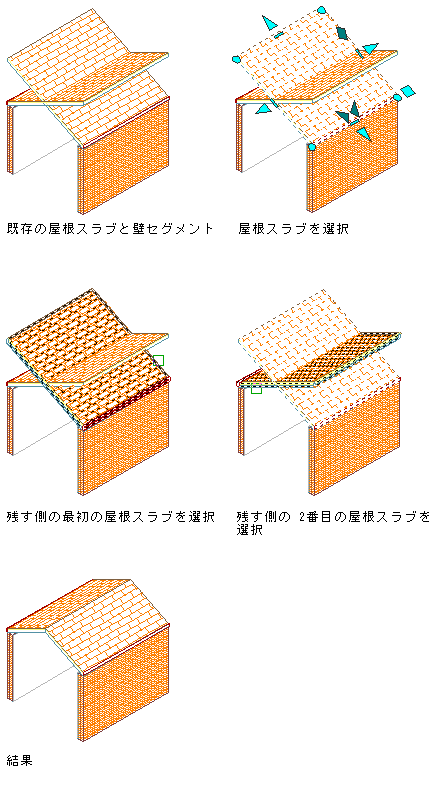 交差する 2 つのスラブまたは屋根スラブをマイター接続するには、次の手順を実行します。 スラブおよび屋根スラブはともに、それらの外周線の交点に沿ってトリムされます。 必要に応じて、頂点が追加または除去されます。 スラブまたは屋根スラブの新しいエッジは、実際にマイター接続による切断を行うのに必要な角度に設定されます。 2 つのエッジのスラブの厚さが異なる場合は、角度が異なります。