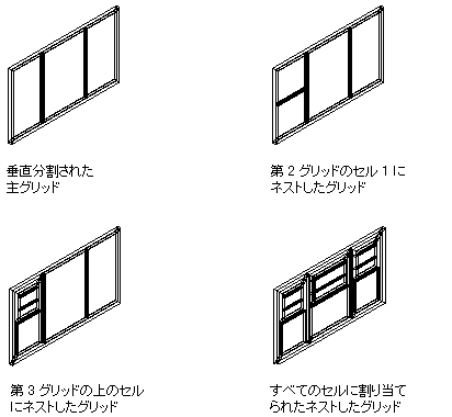 組合せ窓の各グリッドは、水平または垂直のどちらか一方向に分割されます。組合せ窓スタイルのグリッドをネストすることにより、単純なものから複雑なものまで、各種のパターンを作成することができます。