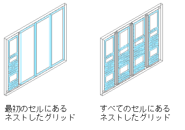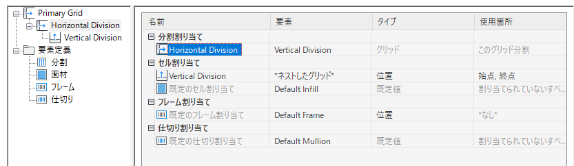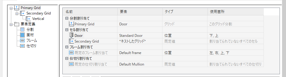 それぞれのグリッドは、独自のセル割り当てがあります。セルへの割り当てには、他のグリッド、パネル面材、またはドアや窓などのオブジェクトが含まれます。