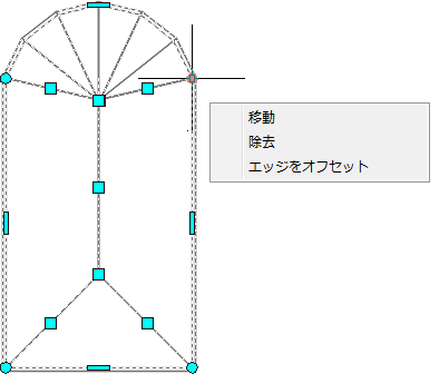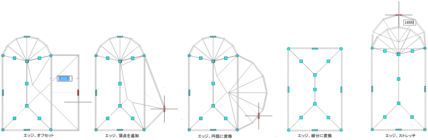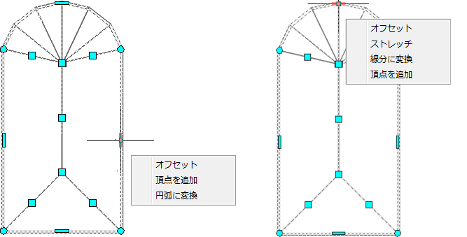 エッジ グリップには、5 つの編集モード、[オフセット]、[頂点を追加]、[円弧に変換]、[線分に変換]、[ストレッチ]があります。