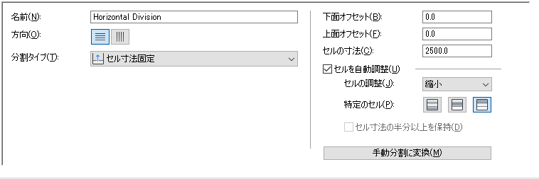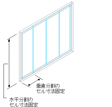垂直分割を定義している場合、セルの寸法は、マリオンからマリオンまでのセルの長さです。水平分割を定義している場合、セルの寸法はセルの高さです。