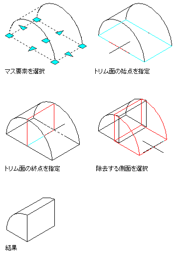 マス要素をトリムするには、次の手順を実行します。指定する分割面がトリム線になります。その後、マス要素のどちら側を除去するかを指定します。