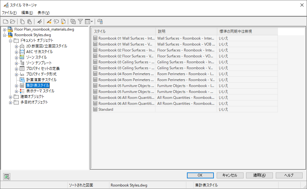 [集計表スタイル]で、図面内の定義済み Roombook 集計表スタイルを読み込みます。