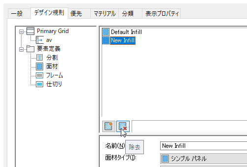必要としない面材定義を面材定義の一覧から削除するには、次の手順を実行します。面材定義がセルに割り当てられている場合、その面材定義を除去することはできません。また、既定の面材定義を除去することもできません。ただし、必要に応じて修正することはできます。