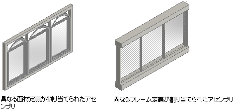 新しい要素定義を作成し、それを組合せ窓内に割り当てることができます。たとえば、複数の面材定義を作成し、次に、グリッドの特定のセルに異なる面材を割り当てることができます。同様に、複数のフレーム定義を作成し、次に、それぞれのフレーム エッジ(上、下、左、右)に異なる定義を割り当てることができます。新しい要素定義の作成と割り当ては、仕切りの定義の場合にもあてはまります。