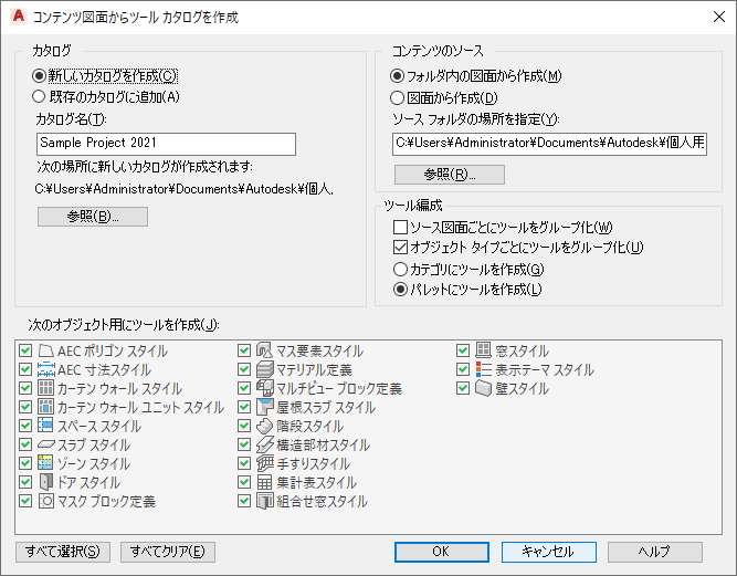 注: 両方のオプションが有効にされると、カタログは最初は図面ごとに、次いでオブジェクト タイプごとにグループ化され、分類は図面から、パレットはオブジェクト タイプから生成されます。パレットはネストできないため、このように実装されます。この場合、分類とパレットのラジオ ボタンは無効になり、[パレットにツールを作成]オプションはカタログ用に選択されます。