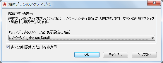 リノベーション プランのタイプを切り替えることにより、図面のさまざまな「ビュー」で作業することができ、複数の図面の編集時に発生しがちなエラーを回避できます。解体プラン タイプの表示設定項目は、[リノベーション オプション]ダイアログ ボックスにあります。既定では、解体オブジェクトには黄色が割り当てられます。
