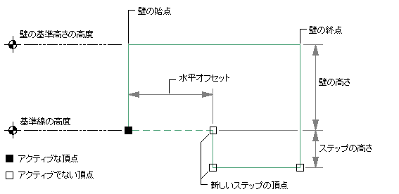 壁のルーフ ラインやフロア ラインにステップを追加するには、次の操作を実行します。 ステップの追加は、プロパティ パレットの[ルーフ ライン/フロア ライン]ワークシートで行うこともできます。