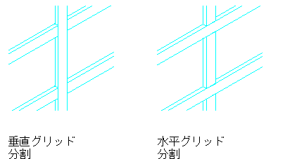 2D レイアウト グリッドからカーテン ウォール グリッドを作成するときには、カーテン ウォールの主グリッドの方向を決める必要があります。水平を選択すると、主グリッドは水平方向に分割され、第 2 グリッドの垂直分割と交差するように重なります。垂直を選択すると、主グリッドは垂直方向に分割され、第 2 グリッドの水平分割と交差するように重なります。