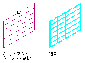2D レイアウト グリッドに基づいてカーテン ウォールを作成するには、次の手順を実行します。図面に 2D レイアウト グリッドが既に存在する場合は、それらを簡単にカーテン ウォールに変換することができます。また、レイアウト グリッドを使い慣れている場合、この方法でカーテン ウォールを効率的に作成でき、カーテン ウォール コマンドについて、さらに理解を深めることができます。