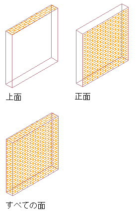 マテリアル定義内のサーフェス ハッチングを表示するオブジェクトの面を指定できます。 たとえば、オブジェクトの前面と側面だけをハッチングするように指定することができます。