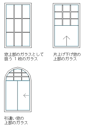 | 最上部のサッシだけに組子を適用するには | [窓ガラス]で[上]を選択します。組子を単一のサッシに適用する場合も[上]を選択します。 |