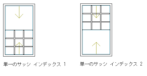 | 個々のサッシ コンポーネントに組子を適用するには | [窓ガラス]で[その他]を選択します。[片開き]を選択し、ウィンドウ サッシのインデックス番号を指定します。サッシは、左下コーナーから反時計回りにインデックスが付いています。 |