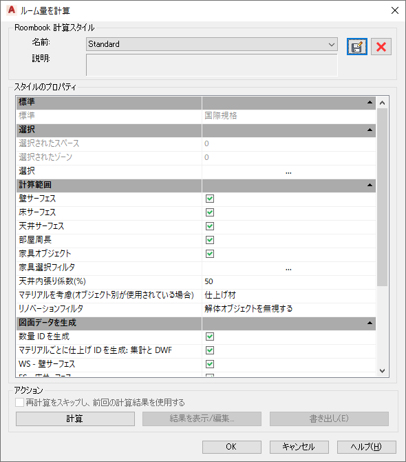 - このダイアログ ボックスで行ったすべての設定(選択、範囲、書き出し)が、現在のルーム量計算のスタイル名で保存されます。ただし、計算設定はスタイル単位ではなく、図面にグローバルに保存されます。計算設定は、新しい計算の前に必要に応じて変更してください。