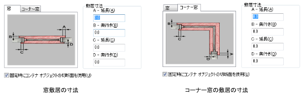 注: コーナー窓の場合、[A - 延長]と[B - 奥行き]は固定された壁に適用され、[C - 延長]と[D - 奥行き]は固定されていない壁に適用されます。