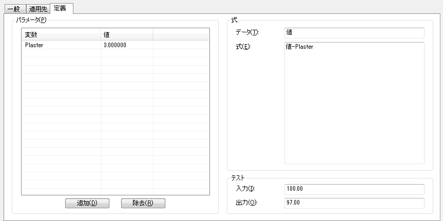 たとえば、3 % のプラスター減少を設定するときに、Plaster_Deduction という変数を定義して、その変数に 0.97 という値を設定している場合は、AreaValue * Plaster_Deduction と入力します。