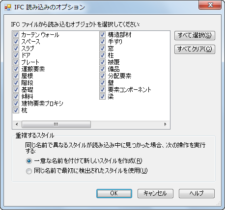 IFC ファイルを読み込む際、読み込むオブジェクトを指定できます。たとえば、IFC ファイルにあるカーテン ウォールだけを表示する図面ファイルを作成する場合には、[IFC 読み込みのオプション]ダイアログ ボックスに一覧表示された他のすべてのオブジェクトを選択解除することができます。図面を表示した場合、表示に含まれるのは選択したオブジェクトだけです。