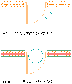 下の図は、注釈尺度と基点に基づいて、2 つの異なる注釈尺度および異なる場所で表示されるドア タグを示します。