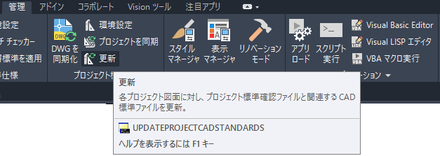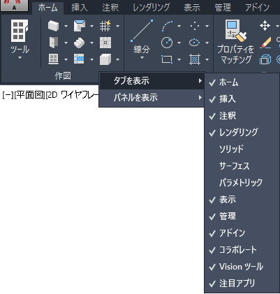 選択されているタブまたはパネル名の横にはチェックマークが表示されます。