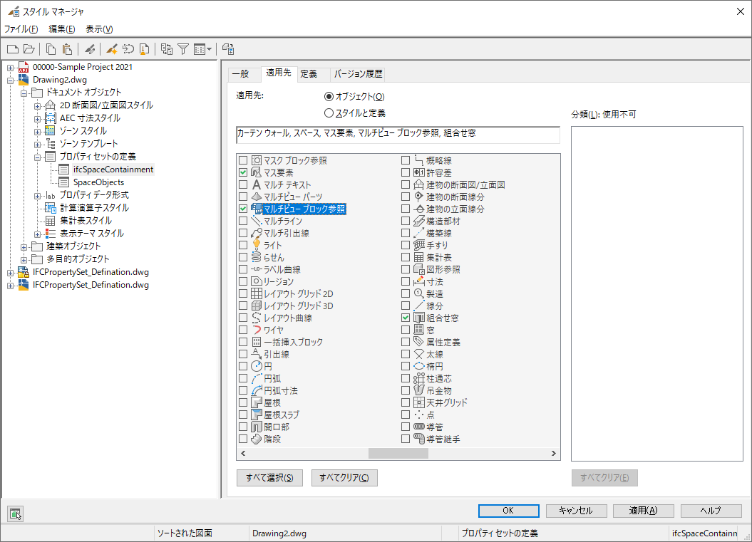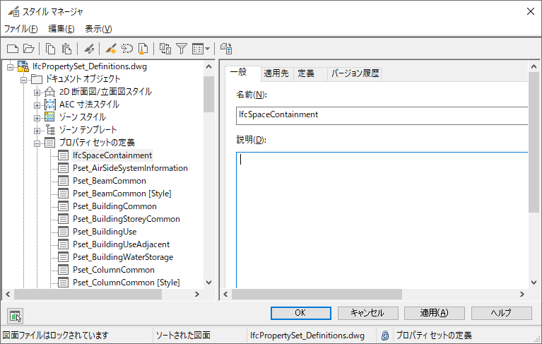 - [スタイル マネージャ]の左ペインで、IfcPropertySet_Definitions.dwg