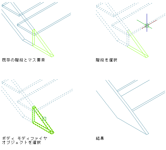 次の図に、マス要素をボディ モディファイヤとして使用し、階段のささら桁コンポーネントに追加する方法を示します。