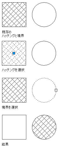 境界の閉じている線図を選択し、それに基づいて、自動調整または非自動調整ハッチングの境界を再定義するには、次の手順を実行します。非自動調整ハッチングが当初に閉じた境界の線図を塗り潰していたが、その後にこの線図がストレッチまたは移動されていた場合は、この手順を使ってそのハッチングを拡張または再配置して新しい境界を塗り潰すことができます。