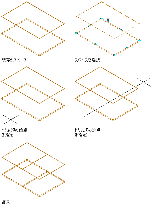 線図、AEC ポリゴン、マス要素の押し出し、スペース、またはこれらオブジェクトのいずれかを含むブロックを、描画した分割線によって 2 つ(またはそれ以上)の部分に分割するには、次の手順を実行します。分割線の両側の部分が個別に選択できるようになります。このオプションを使用して、閉じた境界のオブジェクトを 2 つに分割した場合は、分割後のそれぞれの部分も閉じたものとなります。ジグザグ状の開いたポリラインを縦方向に分割した場合は、選択可能な線分がたくさん作成されます。