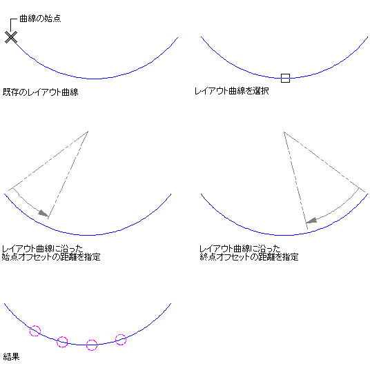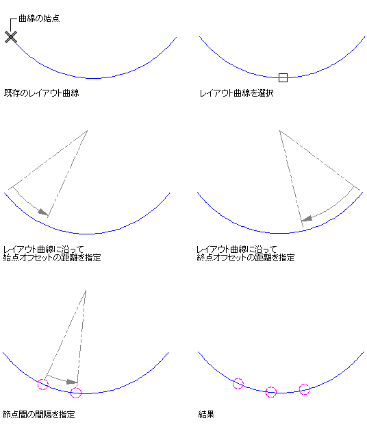 | 曲線に沿って一定の間隔で節点を繰り返すには | r (繰り返し)と入力します。 最初の節点と最後の節点の開始オフセットと終了オフセットを指定し、節点間の間隔を指定します。 |