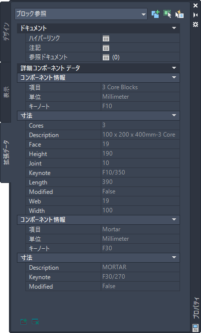 次の図では、コンクリート組積造ユニット詳細ブロックのプロパティ パレットの[拡張データ]タブが表示されています。