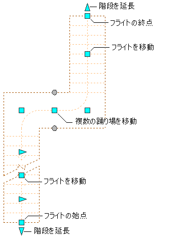 複数の踊り場がある階段のグリップを使用して階段を編集するには、このトピックの手順を参照してください。