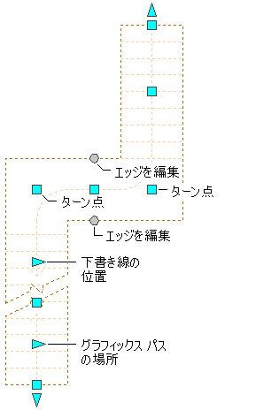 複数の踊り場のある階段の踊り場ターン点、建築ライン ロケーション、グラフィック パス ロケーション、およびエッジの編集グリップ