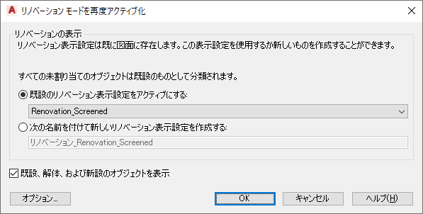 以前にアクティブにした図面でリノベーション モードを再アクティブ化するときは、既存のリノベーション表示設定を使用し続けることも、新しい設定を作成することもできます。