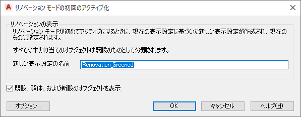 [リノベーション モードの初回のアクティブ化]ダイアログ ボックスが表示されて、既定で新しい表示設定の名前に「リノベーション」という接頭辞が付けられます。