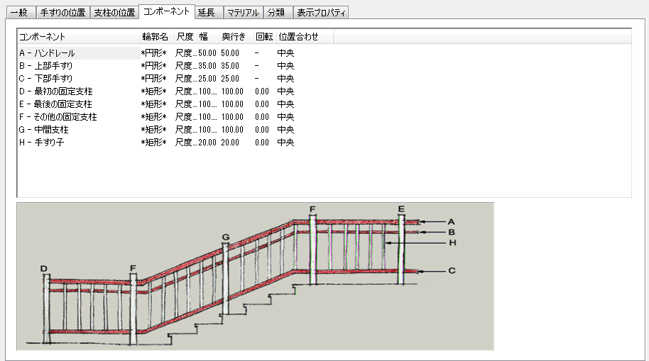 各手すりスタイルに含まれる各手すりコンポーネントについて、形状、幅、奥行き、回転を指定するには、次の手順を実行します。