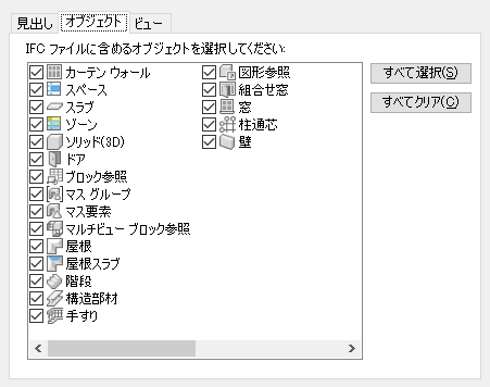 - [オブジェクト]タブをクリックし、IFC ファイルに含めるオブジェクトを選択します。