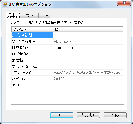 [IFC 書き出しのオプション]ダイアログ ボックスの[見出し]タブに、画面上でアクティブな図面の名前が表示されます。図面の説明、作成者と会社名、許可データ、および建物の地理的位置などの、書き出す図面ファイルに関する情報を追加できます。たとえば、構造図の説明を、[見出し]タブに Structure for Commercial Building 152 と入力することができます。この情報は、IFC ファイルを表示した際に、そのファイルのヘッダに表示されます。
